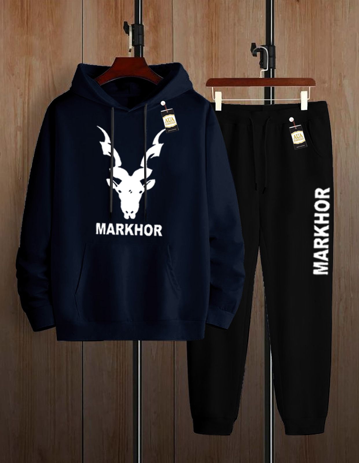 Markhor Prints: Showcasing the majestic Markhor goat silhouette and name in either a navy blue or red hoodie with black joggers.