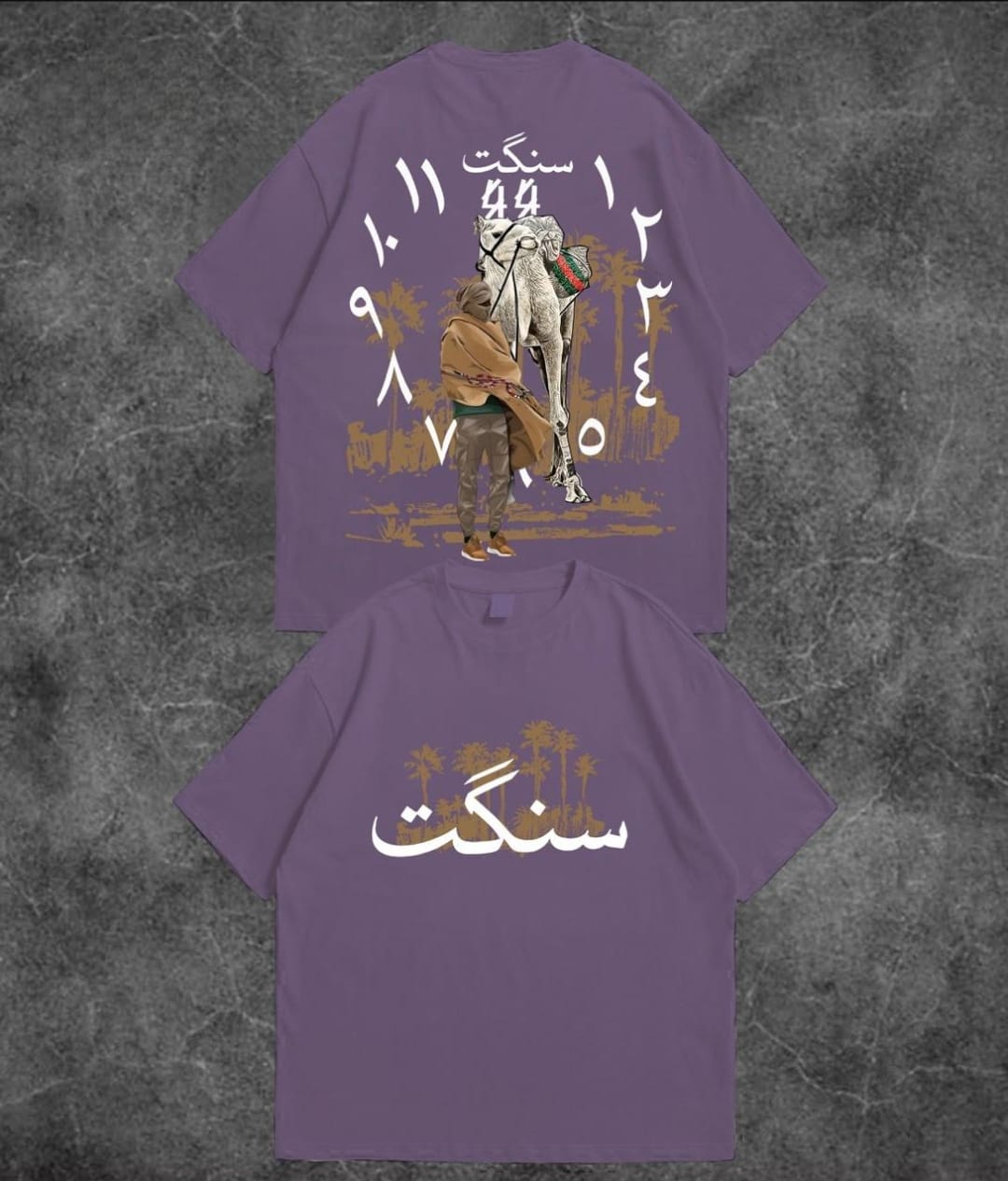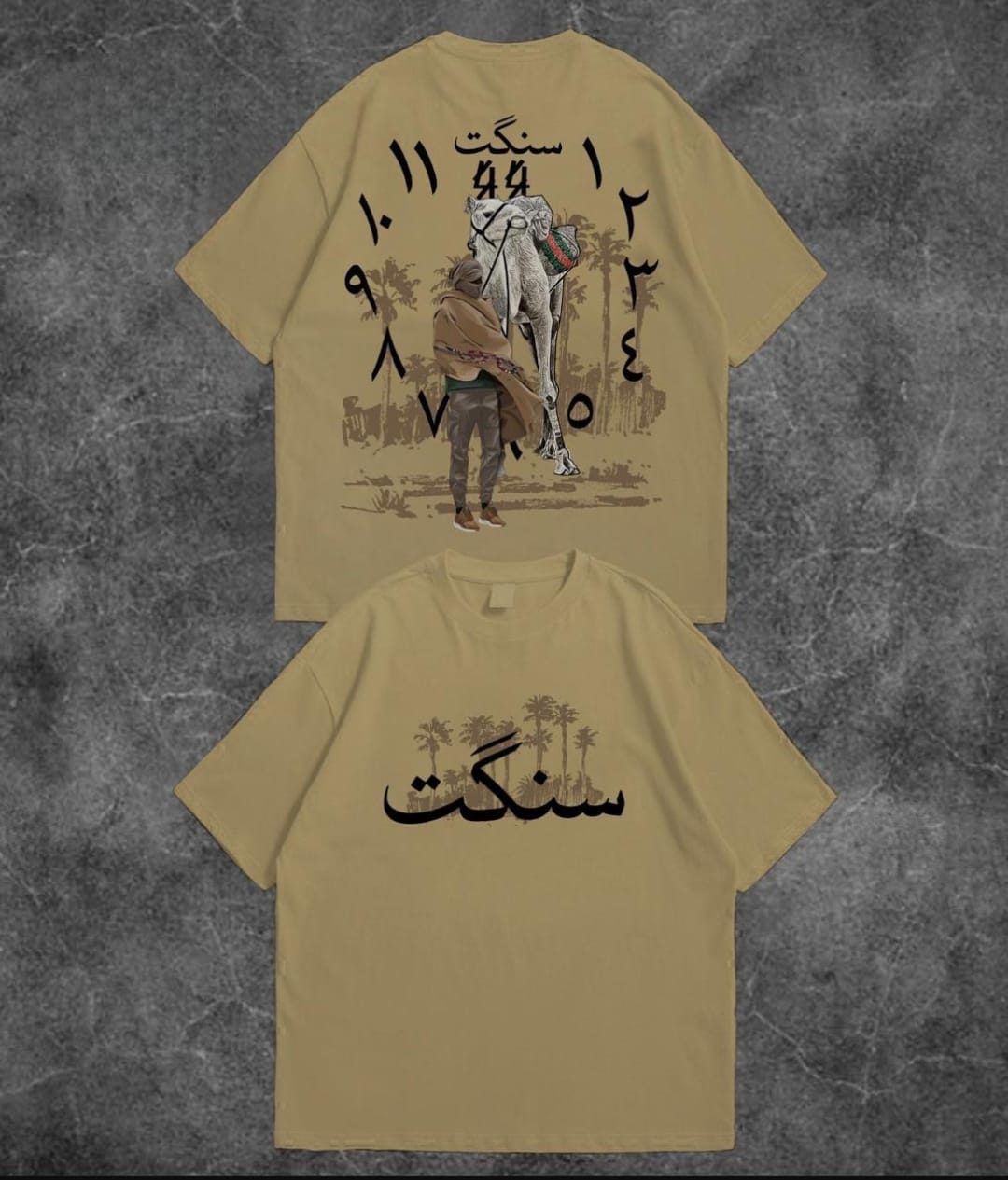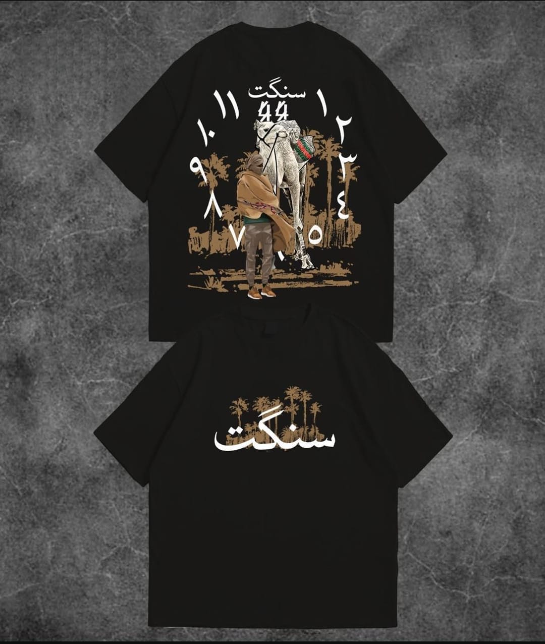 This unique oversized t-shirt combines a vintage-inspired design with modern streetwear style. The back of the shirt features an intricate graphic of a person walking a camel through a desert landscape, with a large, stylized clock face showing Arabic numerals in the background. The front of the shirt features the word "سنگت," which translates to "company" or "companionship," written in elegant white script, with palm trees subtly incorporated into the design.