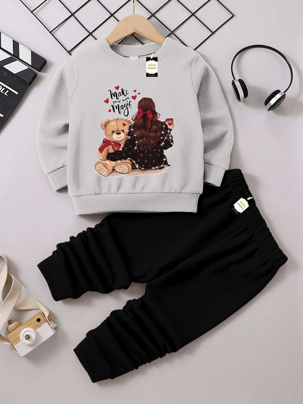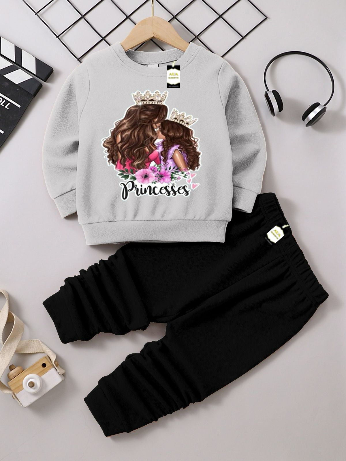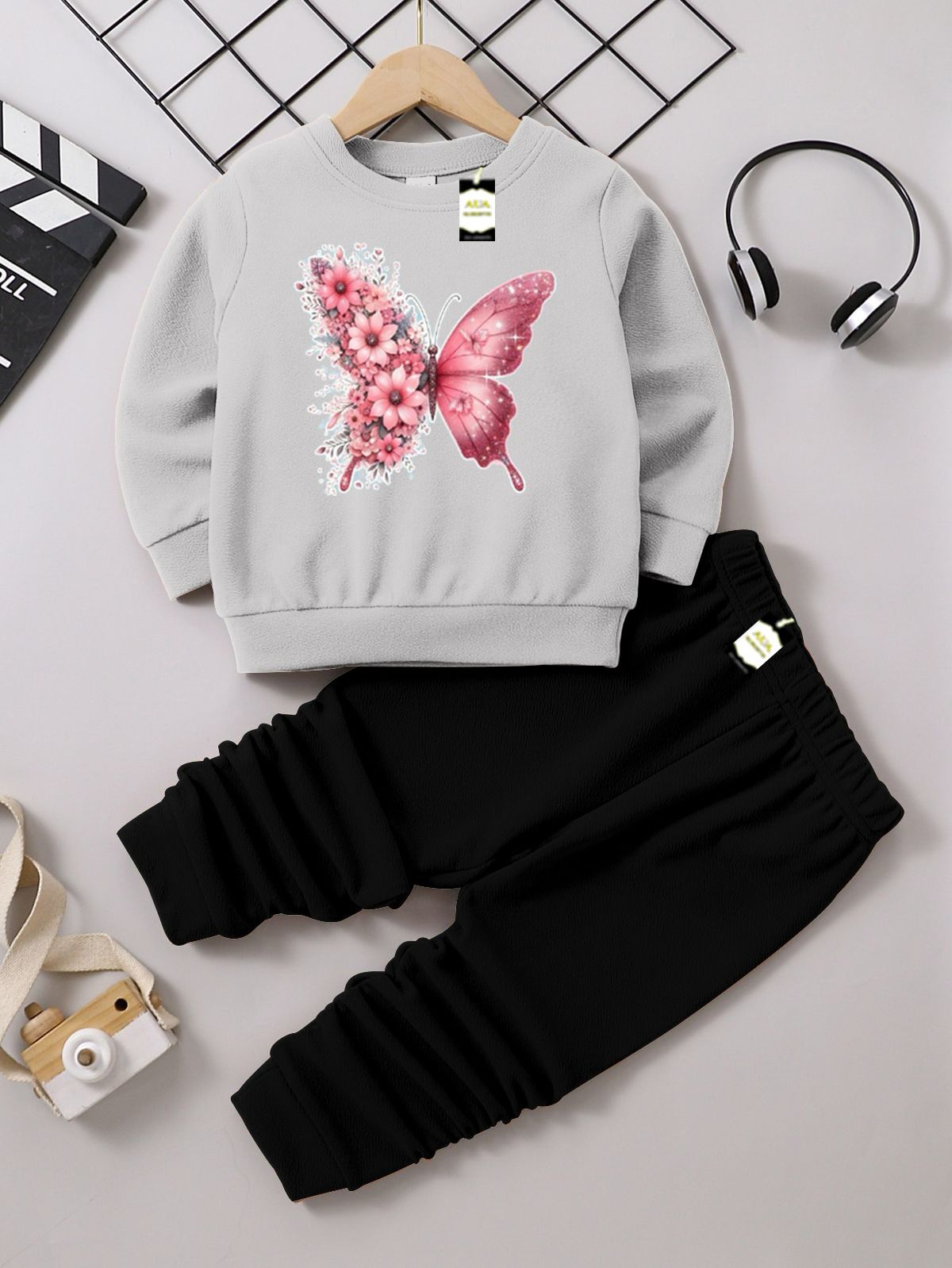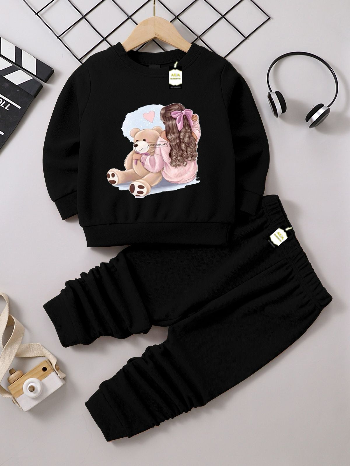 This adorable collection features a set of cozy and stylish outfits perfect for toddlers and young girls. Each set includes a long-sleeve crewneck sweatshirt and a pair of matching black ribbed or textured joggers (trousers), providing a comfortable, casual, and fashionable look.