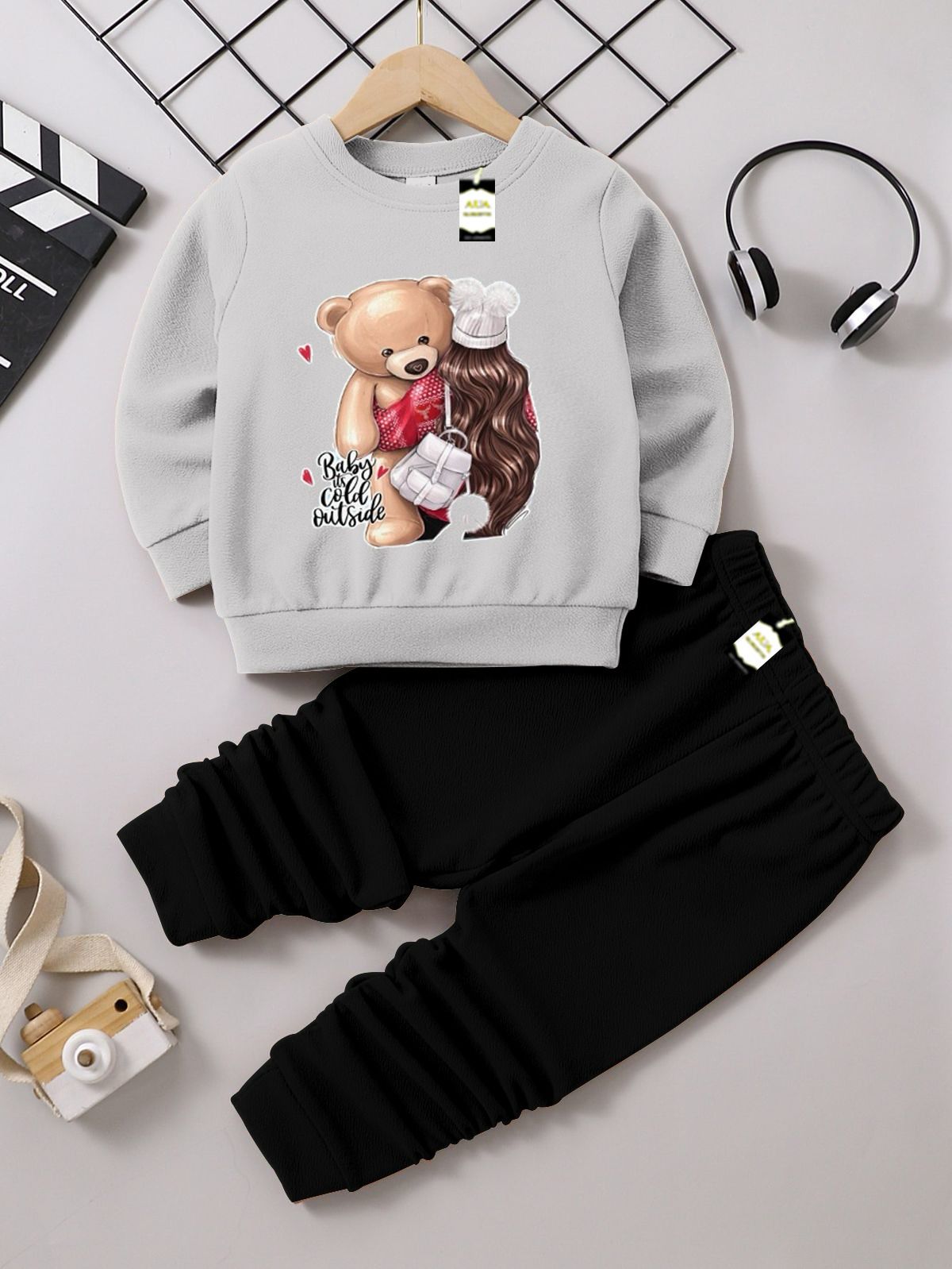 Cute Teddy Bears: Sweet illustrations featuring a girl hugging a teddy bear with various themes (e.g., "Baby Cold Outside" on light gray/navy tops, or a girl with a pink bear and heart balloons on red/black tops).